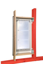 - Insert the inside frame and level it in the opening with the hole transfer jig. While holding the frame flush against the wall, use four wood screws to screw the mounting tabs to the inside of the tunnel.